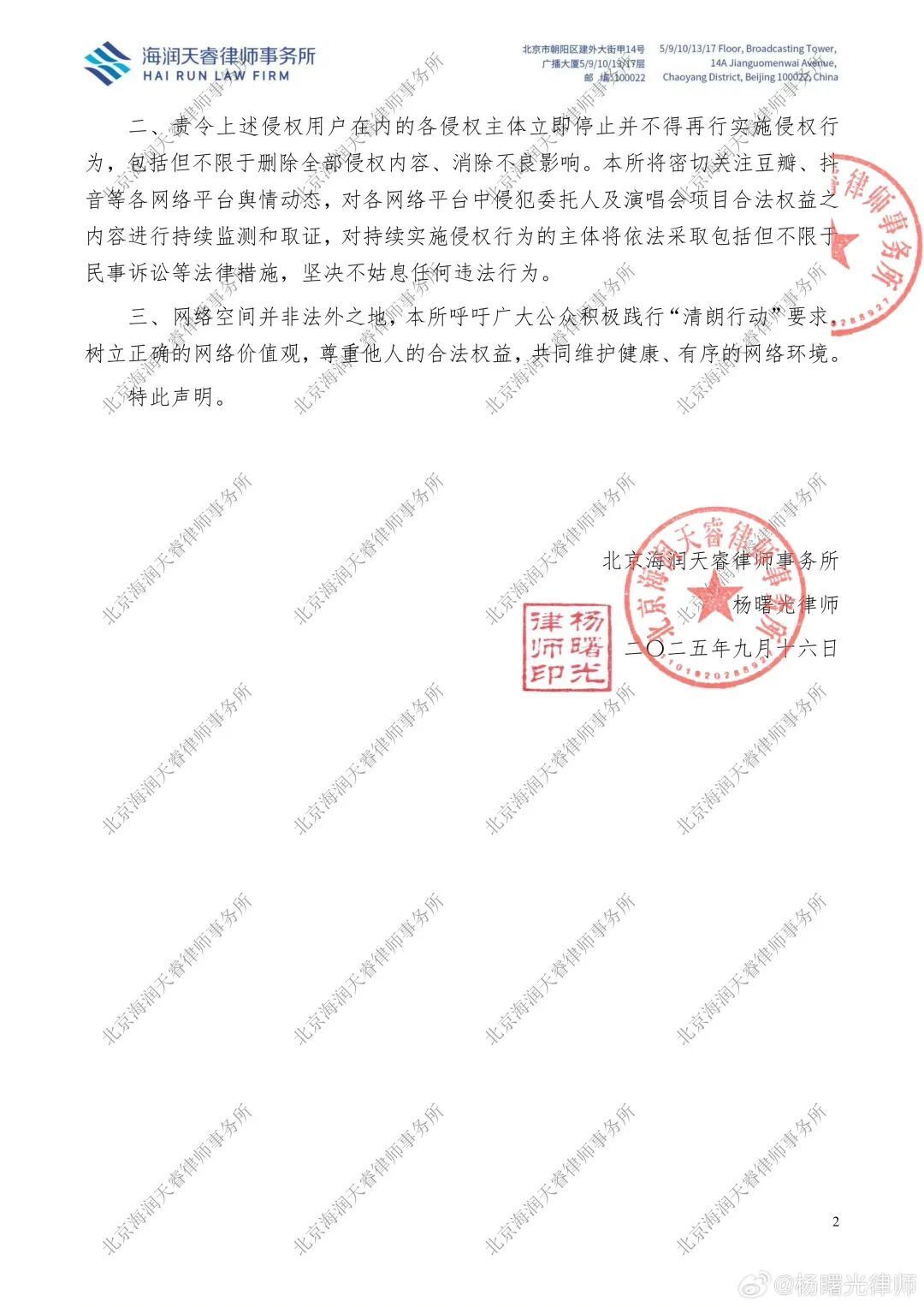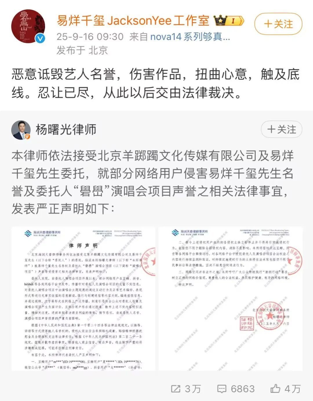 9月16日,易烊千玺方代理讼师、北京海润天睿讼师事务所高档结伴东谈主杨晨曦在微博发布声明,示意照章接受北京羊迟疑文化传媒有限公司及易烊千玺录用,就部分相聚用户侵害易烊千玺名誉、以及易烊千玺“礐嶨”(què xué)演唱会花式“声誉”的关联法律事宜发表严正声明。