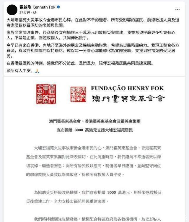 这场五级火警已形成159东说念主受难,31东说念主失联,大宗家庭在火海中落空。失火发生第二天,霍启刚就通过酬酢媒体发声,代表眷属捐出3000万港元用于赈灾重建。他莫得效官方套话,而是直白地说“全港市民同心碎了”,既漫骂死人,又向扶助东说念主员请安,字里行间全是真诚。
