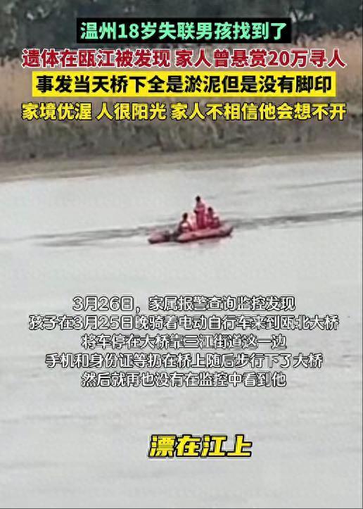 近日,浙江温州一位18岁的男孩在瓯北大桥隔邻走失,家属赏格现款20万元找寻东谈主。